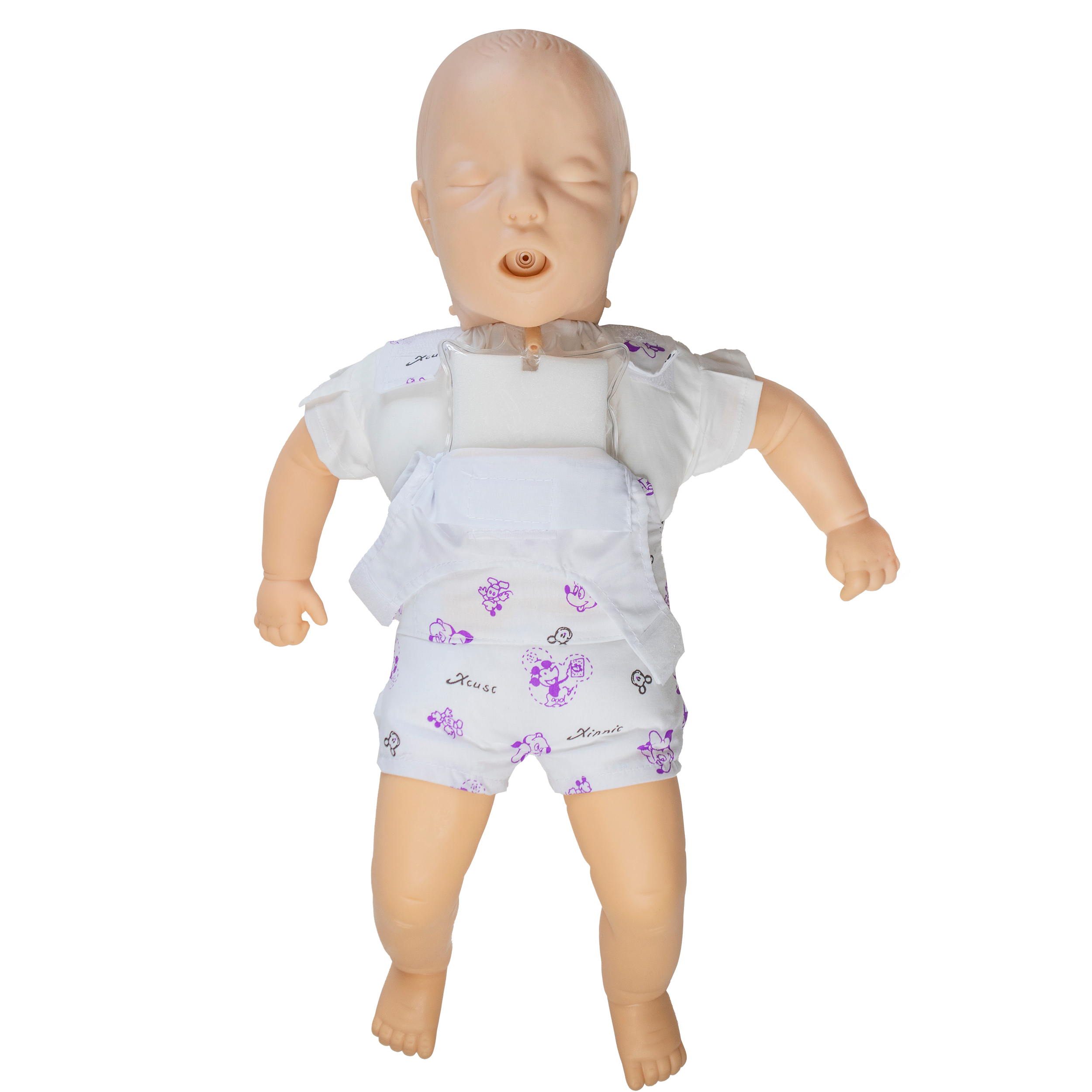 It features a realistic airway that expands the chest when air is blown in during CPR. Its size and proportions are modeled after a standard baby, for a more realistic experience.